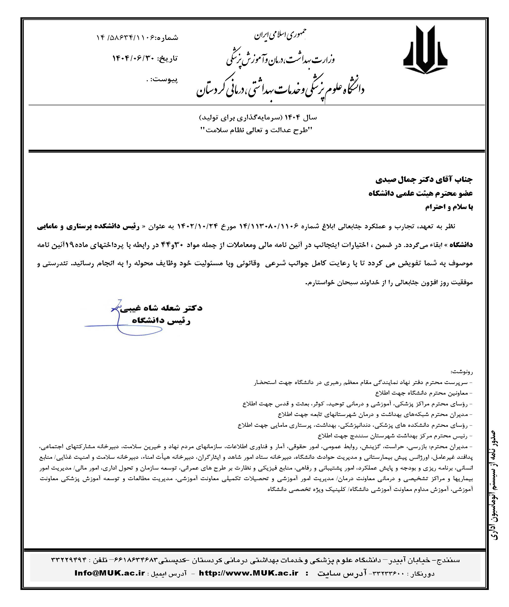 با صدور ابلاغیهای از سوی ریاست محترم دانشگاه علوم پزشکی و خدمات بهداشتی درمانی کردستان، جناب آقای دکتر جمال صیدی، عضو محترم هیئت علمی دانشگاه، با توجه به تعهد، تجارب و عملکرد ارزشمندشان، در سمت «رئیس دانشکده پرستاری و مامایی» دانشگاه ابقاء گردیدند.