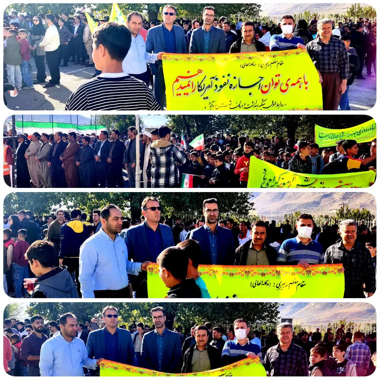 مدیر و مسئولین و کارکنان شبکه بهداشت و درمان شهرستان سروآباد همگام با اقشار مختلف مردم انقلابی شهرستان سروآباد و همزمان با سراسر کشور، در مراسم راهپیمایی سیزدهم آبان، حضوری پرشور داشته و با عزمی راسخ، پیام مقاومت، پیروزی و حمایت از مردم مظلوم فلسطین بویژه نوار غزه را به دژخیمان و مستکبران و رژیم صهونیستی و در رأس آنان آمریکای جهانخوار اعلام نمودند.