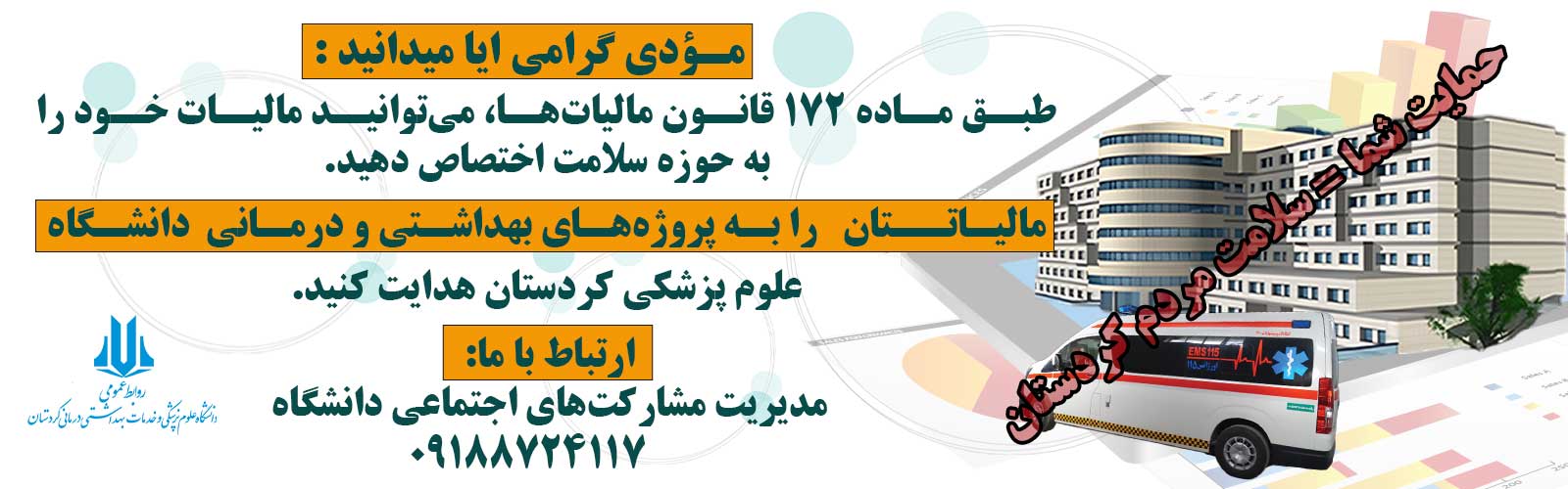 به گزارش روابط عمومی شبکه بهداشت و درمان شهرستان دیواندره، روز شنبه پنجم مهرماه، ساعت 13:10 ظهر، مادر تازه زایمان کرده اهل شهرستان دیواندره به دلیل خونریزی شریان داخلی مثانه و پس از عمل جراحی لاپاراتومی موفق در بیمارستان امام خمینی( ره) دیواندره، جهت طی نمودن دیگر مراحل درمانی، از طریق اورژانس هوایی دانشگاه علوم پزشکی کردستان، به بیمارستان کوثر سنندج انتقال داده شد.